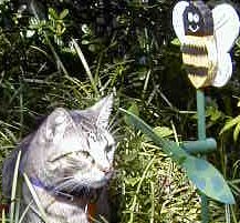 In the picture on the left, he is out in his garden. In the picture on the right, he is letting his tiger stripes do the work.