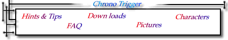 Welcome to the Chrono Trigger page. Small but it IS here. This is still one of my favorit RPGs of all time. When I got chrono trigger I did not even know what it was about. All I saw was "Squaresoft" on the side of the box. That sold me on the spot. RPG + Squaresoft = Kick ass game. |