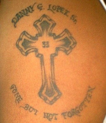 THIS IS A PIC OF MY SECOND TATTOO.. IT IS A CROSS IN HONOR OF MY BROTHER WHO WAS MURDERED IN 1991.. THE "DGL" STANDS FOR DANNY G. LOPEZ.. I GOT THIS TATTOO IN PENASCOLA, FLORIDA AT TATTOOS FOREVER..