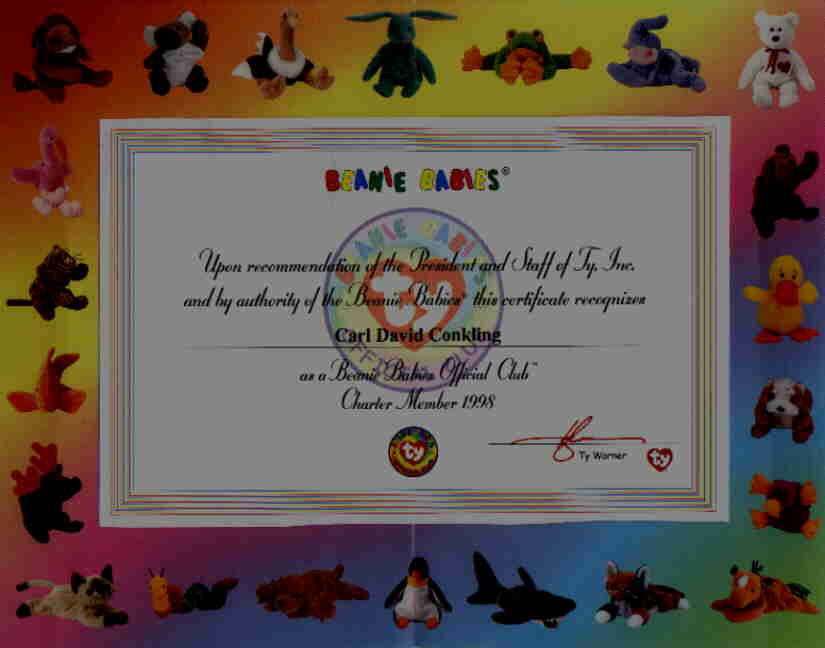 Well, believe it or not I too have caught the Beanie Baby bug. These little creatures will grab hold of your heart in no time. Not only have I been bitten I have even joined the Beanie Babies Offical Club. Below is a copy of my official membership certificate. *huge smile*