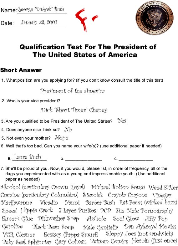 Many of you faithful Unfinished readers are like me and were not aware of one of America's most timeless traditions. It doesn't come in a bun, and no it's not a Baldwin. I'm talking about something called the Qualification Test for the President of the United States of America. It happens immediatly after the inauguration of each new President. It's a sort of placement exam to see if the newly elected President needs to be held back a grade or two. One of my men on the inside has come across George W. Bush's Inauguration Exam and the results are in, he needs to go back to Kindergarten.