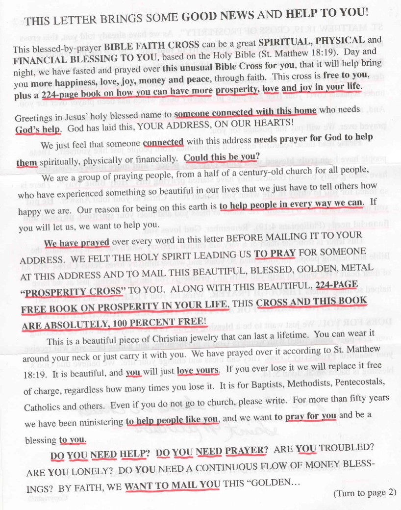 But that's not all! Nope, I also get a free 224-page book on prosperity! Damn, that's a lot of pages. All about prosperity, huh? At this point, I'm wondering what kind of powers will this Bible Faith Cross give me? Laser vision? Infinite health? Heal Light Wounds? Who are these amazing people, anyway? How did they know to contact me? There's just a slew of questions I have. I guess I'll have to keep reading.
