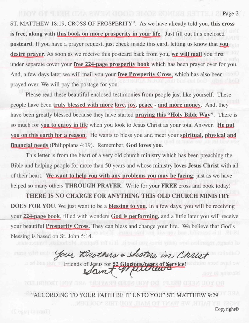 Hey, look, enclosed testimonies! Looks like it worked for other people. They responded and were blessed with a bunch of useless crap and more money! Well that's it. I'm totally signing up for this. I just need to pray The Holy Bible Way, and all my financial and other needs will be taken care of. What do I have to lose? No charge, God's love, a free two-way cross, and a 224-page book on prosperity. Wow. Let's take a look at the enclosed testimonies.