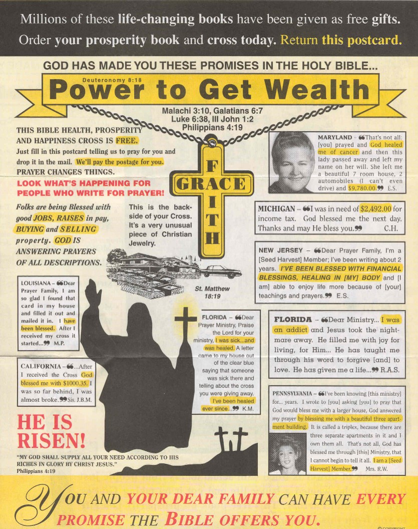 "Power to get wealth". That's what it says. It's so refreshing to find a Christ-based church that encourages its followers to get money. I remember going to Catholic schools and learning that people should give up the need for material possessions and turn their lives to God. That always seemed so passe. Now, this is a church. Love God and Get Money. That's a dogma I can subscribe to.