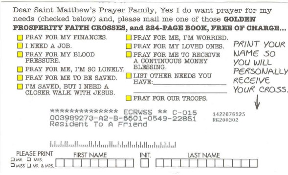 Look at all this stuff they can pray for. You have your money, your job, your health. Maybe you're just lonely and need some Jesus. Maybe you haven't been saved yet. What if you have been saved, but you want to walk closer with Jesus. They've got you covered! Maybe you're worried, or you have loved ones. Maybe you just want endless material wealth. Maybe you want something else entirely. Oh, and support the troops.