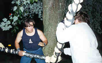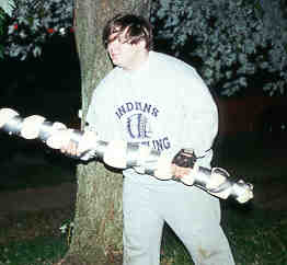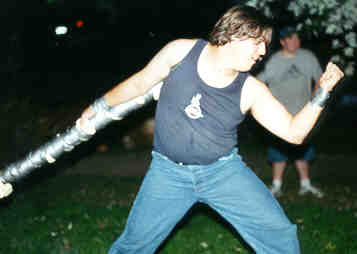 Paco challenged Dave to a duel with Wiffleball bats. They couldn't find any, so they got some PVC piping and wrapped it in foam rubber and duct tape.