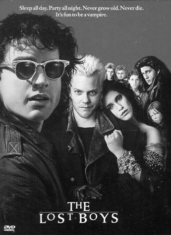 Two boys are moved to a small town when their parents divorse leaves their family broke. Upon arival, the oldest reads the welcoming sign. (Front) "Welcome to Santa Carla, California." (Back) "Murder Capital of the World." After setling in their grandfather's home, Micheal, his brother Sam, and his mother Lucy take a trip to the board walk. While there they meet some interesing people. Micheal sees and instantly falls in love with Star. However, he soon learns that she is part of the group terrizing the beach. Sam, having become board with his brother, has found the local comic shop. Inside he meets the Frog brothers, self proclaimed vampire hunters. They warn him of weird things that have been happening and tell him to give them a call if he needs them. Lucy has found herself in a local video shop searching for a job. The shop is run by a man named Max. Micheal's new friends aren't quite what he expected. After drinking wine, which Star has warned him is blood, Micheal notices that his new friends are vampires. He soon starts to show signs of vampirism as well; sleeps all day, sensitive to sunlight, flies. After learning that his brother, Star, and a little boy named Laddy that is in the group are not yet full vampires and can still be cured, Sam calls on the assistance of the Frog brothers to kill the head vampire. They manage to kill what they believe to be all of the vampires yet the three still show signs of vampirism. Soon Lucy and Max return to the house from their date. After seeing the dead vampires in the house, Max informs the boys that he is the head vampire. en things look hopeless and the boys believe they'll never win, their grandfather drives his car through the front door with a long pole on the front, staking Max. He calmly walks to the refridgerator, while everyone stares at him in shock, and says, "One thing about living in Santa Carla I never could stomach. All the damn vampires."