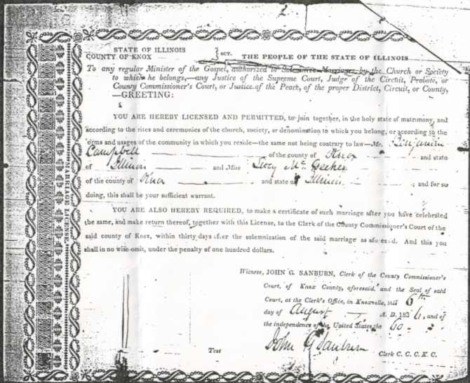was married in August of 1836 in Illinois to Benjamin Campbell..