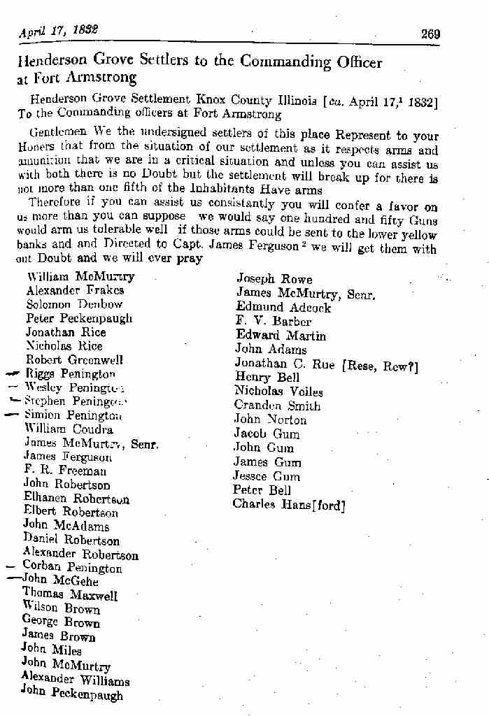 This is the petition for weapons that was made by the inhabitants of Henderson Grove in Knox county Illinois in 1832.