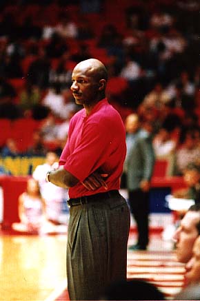Here Cougar head coach Clyde Drexler coaches his U of H squad to another C-USA win.