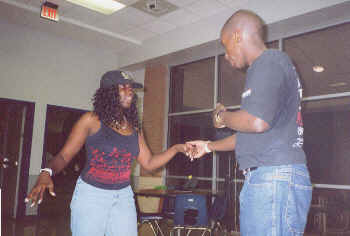 Oneika A and Kevin C share an impromptu dance in the school cafeteria.