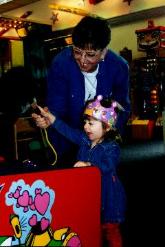 We had a party at Chuck E Cheese's. Here's me playing a game with my Grammy. We had FUN!