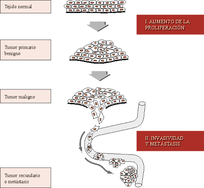 La progresiva acumulación de mutaciones, probablemente en una secuencia específica para cada tipo celular, origina primero una hiperplasia o crecimiento desordenado, y luego invasividad celular, vascularización o angiogénesis y, finalmente, metástasis.