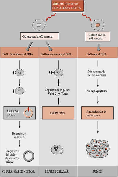 Los genes reguladores normales pueden clasificarse en aquellos cuyos productos estimulan la división celular y aquellos cuyos productos la inhiben. Por lo tanto, existen dos caminos de mutación hacia la proliferación celular incontrolada y la invasividad. El primero consiste en que un gen estimulador se vuelva hiperactivo; este tipo de mutación tiene efecto dominante. El gen alterado se denomina oncogén y su alelo normal proto-oncogén. El segundo camino consiste en inactivar un gen inhibidor, cuyo efecto mutacional es recesivo y el gen implicado se denomina gen supresor de tumores.