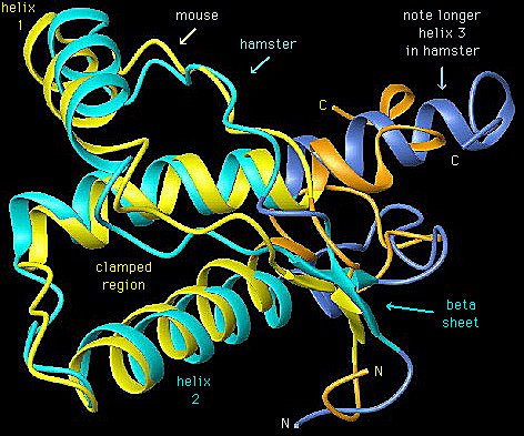 ¿Pero cómo puede ser posible que una proteína tenga por sí misma naturaleza infecciosa? Los estudios rebelaron que una forma de la proteína PrP existe en la mayoría de los cerebros sanos de muchas especies animales: la PrPc sería entonces una forma de la proteína priónica no infectiva, ya que al inocularla en cerebros sanos no es capaz de desencadenar la enfermedad. Estas dos formas de una misma proteína contienen la misma secuencia de aminoácidos, pero su conformación espacial terciaria difiere; así, la forma infectiva, PrPsc, está formada por dos alfa-hélices y cuatro hojas-beta, mientras que la forma no infectiva (PrPc) contiene muchas alfa-hélices.