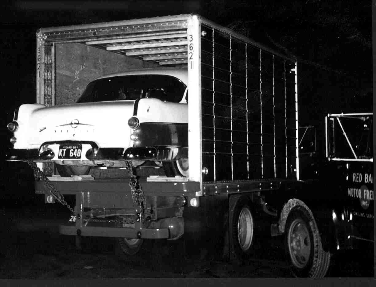 Here is another interesting picture provided by Bob and Ruby Shaw. Red Ball had purchased several new bobtails for the Amarillo terminal and the Dallas "jack of all trades", Bob Shaw and several other drivers were given the job to get them from Dallas to where they were needed. Bob had a new Pontiac, which was loaded into one of the trucks and was used to transport the drivers back home after the delivery.