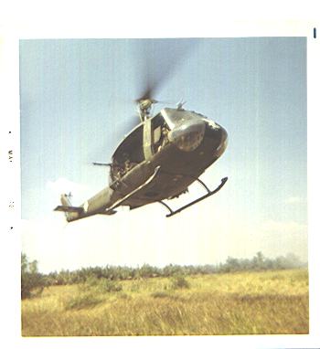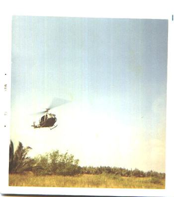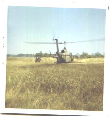 Picture 131 - Huey coming in to pick up the 2-1 Squad of Bravo Company during airmobile operation in January 1970. |