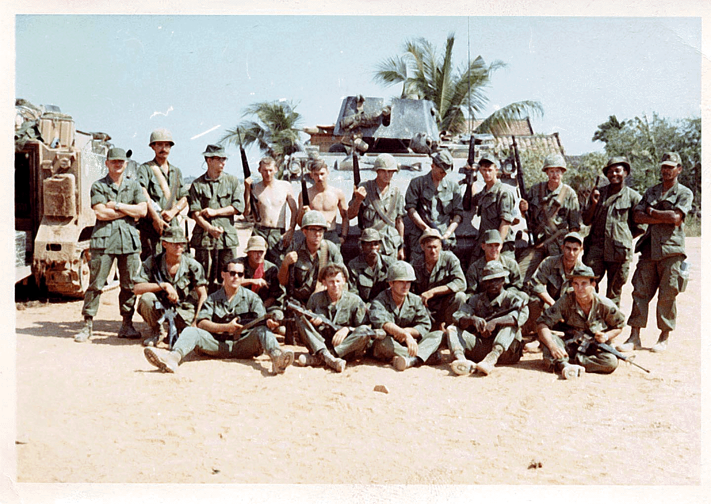 From left to right Front row: SP4 William H. Rotz, SP4 Gerald V. Newell, SP4 Kenneth W. Kenyon, SGT Turner Taylor, SP4 George Walker Second row: SP4 Stephen J. Ondrovic, SP4 Jeffrey E. Northridge, PFC (SP4 shortly thereafter) Robert J. Trombley, SP4 Herman Swan, SP4 Stanley Sawford, SP4 Michael E. Parks, SP4 Johnny Seale Third row: SP4 Terry Hopkins, SP4 Michael B. "Bullwinkle" Wier, SP4 Gene "Doc" Johnston, SGT Don Daily, SP4 William A. Franklin, SGT Scott D. Schoeben, SGT Michael L. Alden, SP4 Ira D. Lewis, SP4 Corey S. Buckner, SP4 Lewis Henry, SFC Willie Wells. Missing from picture due to R & R: SP4 Jack Beck and SGT Gonzalo "Poncho" Ruelas. Missing from picture due to reasons unknown: SGT John Coleman, SGT Hugo Zagarolo, SGT Erwin D. "Skip" Knauer, SP4 Michael D. Matos, SP4 Thomas P. Horrmann, SP4 Dennis "Deejay" Lay, and Tiger Scout Lu (although he was lurking about at the time). This photograph was provided by Mrs. Carol "Rocky" Tank ("Bullwinkle's" sister). |