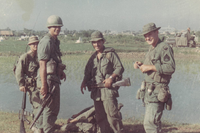 Picture 139 - Members of 1st Platoon Bravo Company. Lou Schneider provided the following: "This is Bravo 1-1 Squad. Bottom row left to right: Gene Woods, Chuckles, and Dot. Top row left to right: Mark Whitlock, Lou Schneider, Rooney, and Sonny."