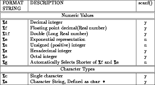 The following format strings can be used to specify data to be printed or read using the printf or scanf functions, or any of their variants; fprintf, sprintf, fscanf or sscanf .