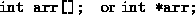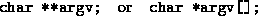 Either of these definitions is independent of the size of the array being passed. This is met most frequently in the case of character strings, which are inplemented as an array of type char. This could be declared as char string[]; but is most frequently written as char *string; In the same way, the argument vector argv is an array of strings which can be supplied to function main. It can be declared as one of the following.