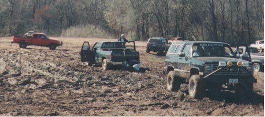 I believe this was the first stuck of the day, it wouldn't be his last either. He enjoyed turning donuts in his 2WD, and flingin' mud at nearby sout owners that were lunching. Doug's hoss Blazer can be seen here helping his fellow Aggie.
