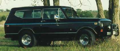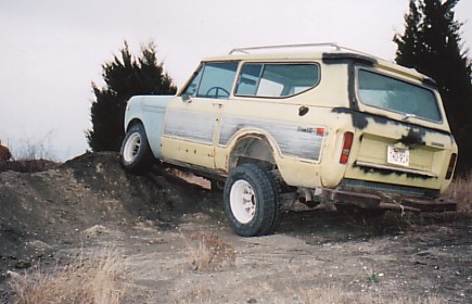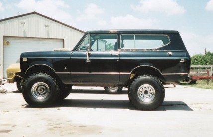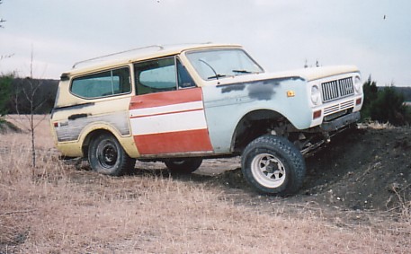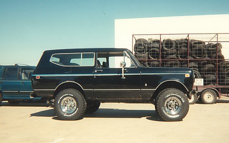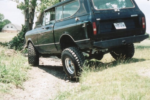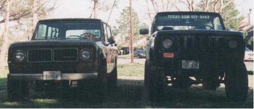 A little comparison shot between a stock height spring Scout with a two inch body lift, and a Scout with a 4" suspension, reverse shackled, 1.5" body lift. Note Brandon's schweet liscense plate.