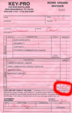This was the discounted price for opening up the van and making a key for it. He had to make one for Cynthia's car too and charged full price of $75, because I lost her key as well. I felt pretty crappy about it, but there was nothing I could have done except not wear the keys around my neck while swimming...
