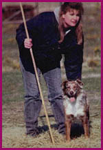 Tess is a red tri female. She is an athletic heading and heeling dog. She can jump straight up and lick the end of your nose and never miss a step when she hits the ground in a run. She tells ya "good morning" and will "talk " to you at any oppertunity. She is vocal except on livestock. She tends to "root" on ya for attention instead of licking you. Tess is definatley a character. Her structure is feminine and athletic.