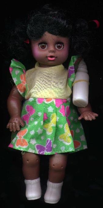 This 8" drink and wet toddler has her own bottle, sleep eyes and a crier. Cost......$1!