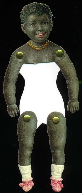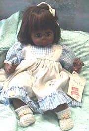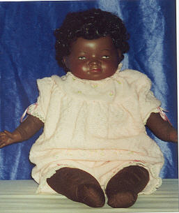 Sue/lkmt's doll: AmoSandra doll by Sun Rubber Co. about '49-'50. I've had her since I was teeny (used to have two, but my dog chewed one up 20 years ago, grrrr.) She is 10", and has repainted hair and mouth - her rubber is getting very dry and I'm going to give her a bath in AmorAll one of these days. Evidently she is the little girl's doll from the Amos 'n Andy radio show.... Has "Columbia Broadcasting System, Inc." and "Designed by Ruth E. Newton" as only part of the extensive labeling on her back.