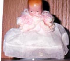 The first bisque dolls were the "Hush-A-Bye Baby" dolls with bodies made in Japan. They are 3-3/4" in height and are marked a follows:
