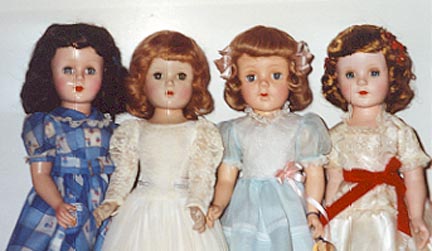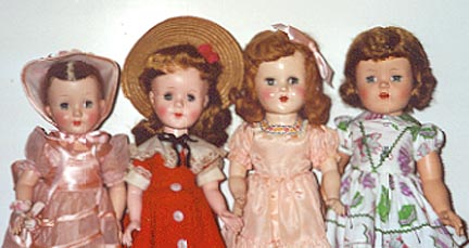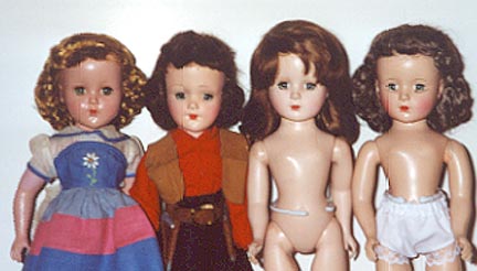 4. This is a mystery doll I've never been able to id. She has a lovely "matte" finish, unlike your usual shiny hard plastic. She is 15-1/2" and totally unmarked (not original dress). When I first got her, I thought she was a "Cindy", but after I found a real one I could see the difference. Her saran wig is in the original set.