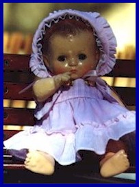 Patsy Mae. Mid 1930's. Patsy Mae comes in two sizes, 28" and 30". Composition head, arms, and legs on a cloth body with the Lovums shoulder plate. Both arms are slightly curved and only the lower parts of the leg are compositon. Wig is human hair of different colors . Eyes, green or brown sleep eyes. Mark: On the head,