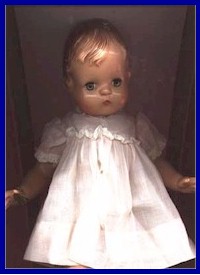 Patricia from 1932. Size14 1/2". All composition with both arms slightly curved. Plain head covered with a mohair or human hair wig in a variety of colors . Eyes were brown, blue, or green sleep eyes and a closed mouth. Mark on the shoulders: