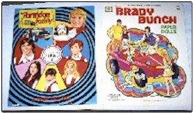 Coming into the 1970s TV shows were still popular subjects. Artcraft's 1971 Partridge Family shows the famous singing family and their psychedelic bus. Whitman's 1973 Brady Bunch is a great book with mod fashions. Sadly they omitted 3 family members: Peter, Bobby and Alice.
