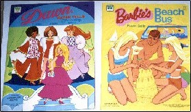 Whitman's 1970 Dawn features Topper's 6 1/2 inch doll and friends along with actual fashions and a stage to model them. Barbie and her gang tanned and went to Malibu in the 1970s. This Whitman 1976 book also has a stand up of the Beach Bus that was sold for the dolls.