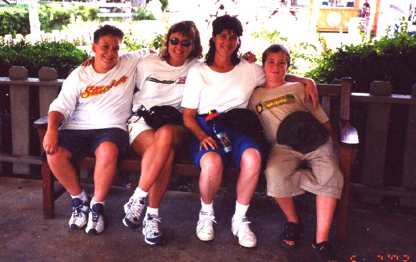 Frankie, Linda, Carol, and John waiting for the train ride at Fiesta Texas