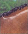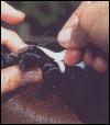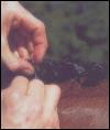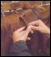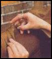 Study your horse's neck to see how to present the mane at its best. A thick cresty neck will look finer with neat braids pulled down into the crest. A rather weak neck will enhanced with larger braids placed on top. There is no limit to how many braids you can do in the mane, as long as they are evenly spaced. You can finish off with the English method, which is a "button" effect, or the continental style of a long fold of braid usually taped in white. The forelock is done separately in the same style as the mane. The braids can be secured with thread, which should match the color of the mane, of rubber bands.