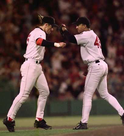 Nomar congratulates Pedro after a good outing in game 3 of the 1999 A.L.C.S.