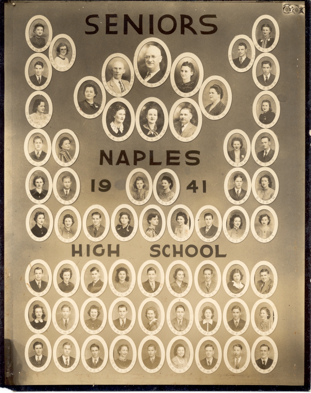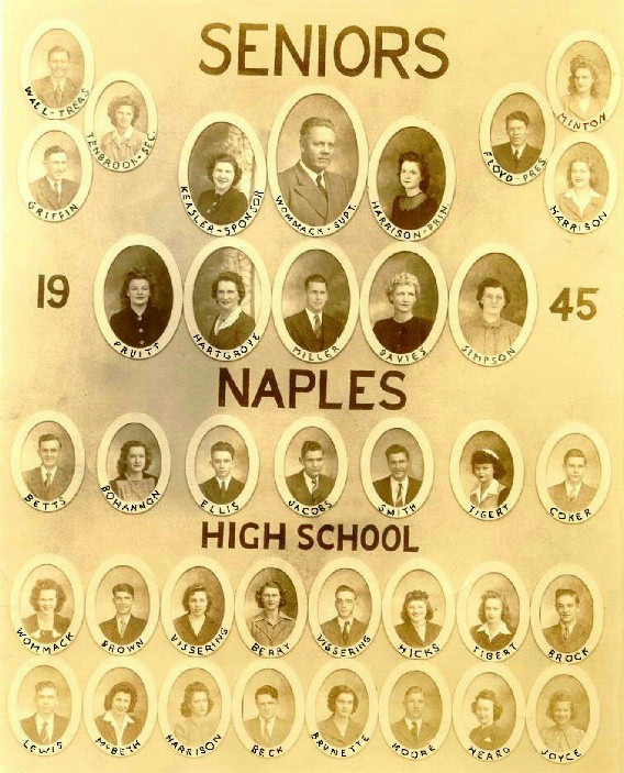 The above photo is the 1941 Naples High School Senior Class. The class included Joan Shankles, Class Secretary Polly Campbell, Class Valdictorian (Dr.) I. M. Watson, Dalene Wyninegar, Bill Falls, Lila Gibson, Christine Hawkins, William Henry "Bill" Watson, Anita Rampley, Alice Boddie, Delwyn Moore, Iva Nell Jackson, Waldene Autry, Eugenia Berry, Iwanna Bryan, Betty Lou Irvin, Billy Simmons, Maxie Harrison, Faye Hervey, Chesley Tigert, Alta Faye Baskin, Helen Eaton, Jack Betts, Margie Nell Brock, George Gibson, Class President Jack McCoy, Odalee Davies, William Stewart, Hazel Loffer, ? Hogue, Mary McMichael, Ray Wommack, Joyce Kesseler Wommack, (Dr.) James Stewart Leeves, Eula B Tuck, Billy Jack Coode, Dorothy Elliott, ? Wommack, Marcelle Lawhon Shaddix, Porter Shaddix, ? Hawkins, David Grandberry (whom they named the Naples hospital after), Lila Merle Hampton, George William Hampton, Joyce Causey, Roly M Tuck, Bernard "Toe" Anthony, Ray Green, Jaynelle Robinson, Jack Barnes, Mavis Walker, Connor Mathews, Edgar Jolly, and Harold "Sonny" Huffman. The teachers are Archie Stewart, ? Stewart, H. T. Morris, James Kennedy, Gertrude Nolen, O. B. King, Opa Faye Kirkham and Ermadine Walls.