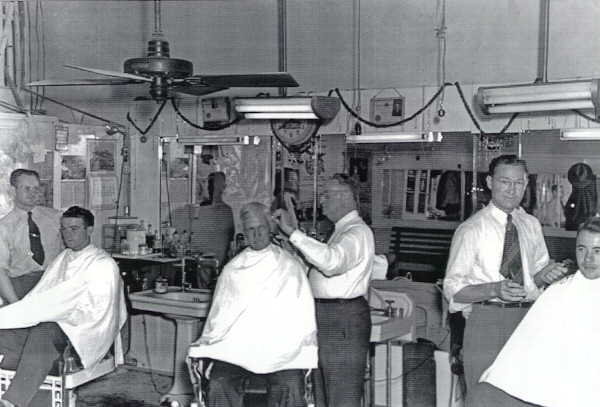 This photo was taken circa 1946 in the old Naples Barber shop. Barbers from left to right are Ellis Shirey, Alva D Story, and Roy Stapp. The customers are Lenoy Slider, and unknown fellow, and Buddy Campbell.