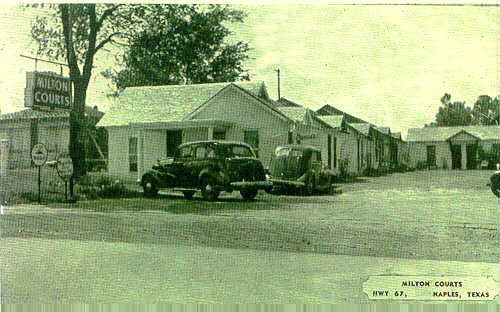 This is a photo of the old Milton Courts that was located just to the left and behind the service station in the preceding photo. The photo was probably taken circa 1940, judging from the automobiles. It looks like about a 39 Ford in the background and maybe a 38 Buick or Pontiac in the foreground.