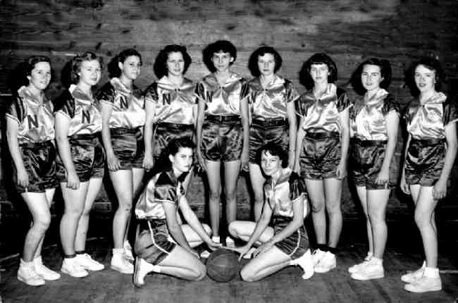 This is a photo of the 1949 Naples High School Buffalo girls basketball team in their green and gold finery. Kneeling are Lucy Capps Myers and Johnnie Simmons Hartgrove. Standing are Barbara Davis Terrell, Betty Duncan Moore, Betty Mize Stevens, Patricia Wommack Forrest, Mary Frances Spence Mize, Jeanette Hampton Miller, Wanda Davis Ramsey, Doris McCord Lowery and Reta Grisham Voss.