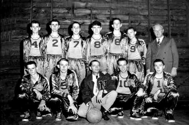 This is a photo of the 1949 Naples High School Buffalo boys team. In the front row left to right are Carroll Harrison, Jack Coker, Coach W A Bishop, Ronnie Merrell, and Wendell Tenbrook. In the back row are Billy Brunette, Arthur Guy Wommack, Richard Cole, Waylon Buchanan, James Day, J W Henson, and Superintendent Kermit Wommack. It looks like the photo was taken inside the old gym.