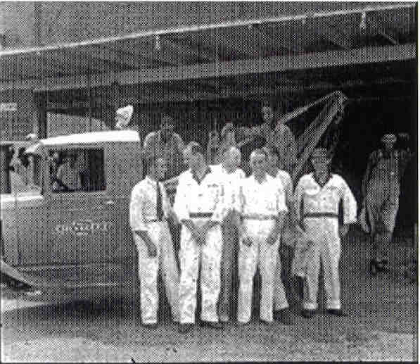 This is a photo taken during the 1930's of the employees of Matthew-Coker Chevrolet Company. The business was located where the Morris County National Bank is now located.