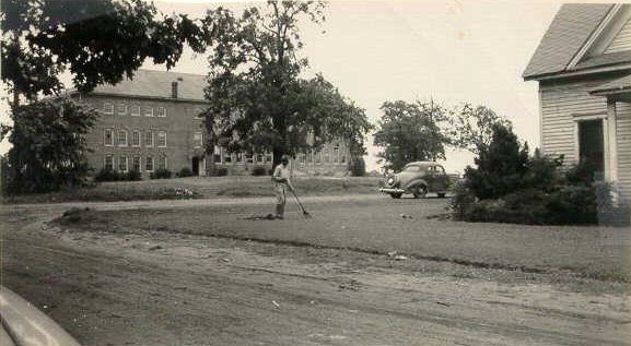 This photo was taken about 1940 in the neighborhood of the Omaha School. The fellow raking his yard is T.L. Moon.