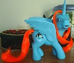 My custom Teddy-chan, made from a G3 Waterfire. I made her wings and horn out of sculpey modeling clay and painted them to match her body. She is my first custom made with sculpey parts. I think she turned out ok. |