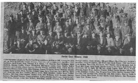 Bardo coalminers in 1940, all alone in front of the group is Connie Deason, First row, left to Right E.F. Smithers, Carl Smithers, Ancil Rose, Boss Thomas, R. J. Nolan, C.S. Deacon, Bart Williams, Shell Sanford, Chester Lyttle, Elmer Richmond, Brownlow Estes, Jesse Mattle, Rufus Jackson, SECOND ROW, Left to Right, Albert Senters, Charlie Marlin, Thelman Bray, Frank Mattie, Harrison Gibson, Cecil Towe, John Thomas, Homer Clotfelter, Hosea Thomas, Charlie Logan, Henry Orick, Clum Fowler, Gilbert Towe, Earn Thurmon, Sam Huston, THIRD ROW Left to Right, R.O. Holden, Henry Orick, Britt Hensley, Archie Bray, Luther Perkins, Bill Cole, Cecil Dephew, Walter Ellis, Otis Williams, Alex Jackson, Harver Garrett, Marshall Hensley, Lucas Bredlove, Arthur Mattie, FORTH ROW Left to Right, John Dean, George Goins, Ken Wilhoit, Ben King, Charlie Thomas, John McDaniels, George Atkins, Clyde Brooks, Millard Wilhoit, Byrd Garrett, Ambrose _?_, Emory Hopkins, Doug Davenport, Alf Bruce, Clyde Forax, 5th row, left to right:Woodroe Holden, Alex Ellis, Ira Grant, Bert Taylor, Dallas Howard, A.B. _?_,, ? Ward, Bill Trent, Charlie Senters, Roy Estes, Bob Mattie, _?_, 6th. row, left to right: Ed McVey, Clyde Logan, Estel Ward, Frank ? Deacon, James Bray, Andrew Elwood, Wilber Taylor, Rodney wilson, Ike Rhea, ? Trent, Clarence Parker, Dan Simpson, Sam Gibbs, Harley Thomas, H.L. ? Garrett, 7th. row, left to right: Bob Atkins, Harvey Seals, _?_, Henry Jones, Bob Estes, Elmer Smith, Cleat Roberts, Jim Thompson, _?_, Chess Tye, Walter Jones.
