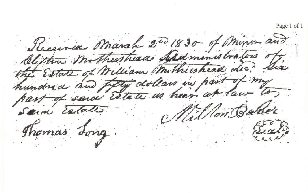 cousins, this is a receipt to Milton Baker Great Grandfather of Susan Lenora